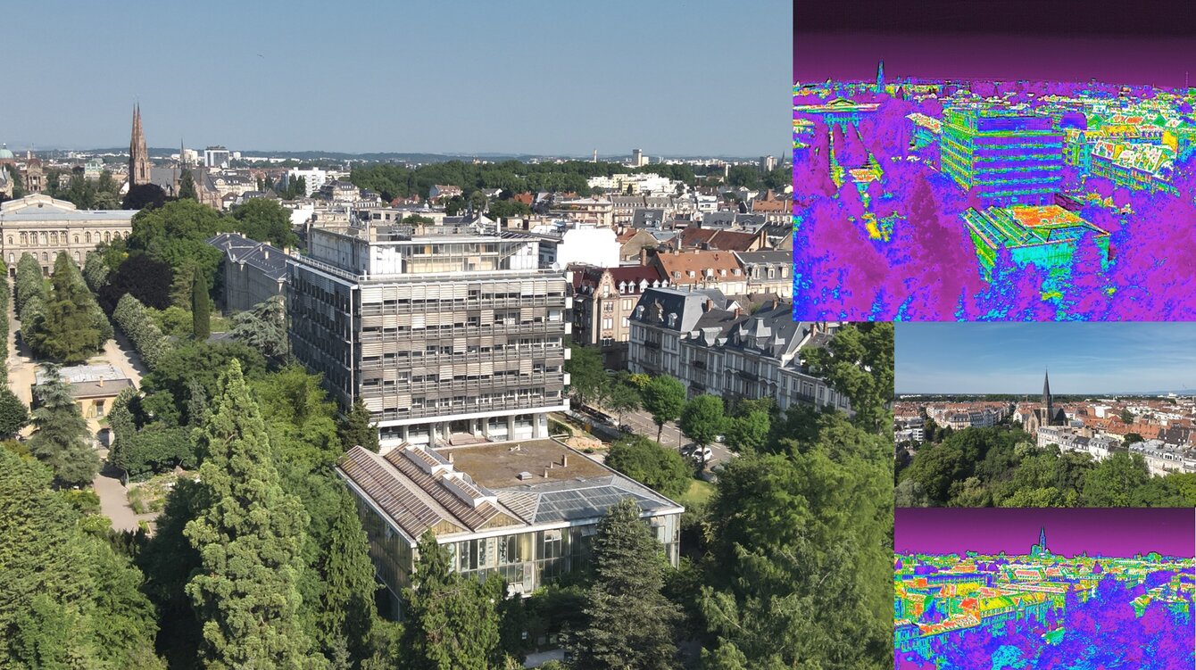 Vue aérienne et en caméra thermique de l'Institut de Botanique et de la ville alentour (photos M. Lucchini)
