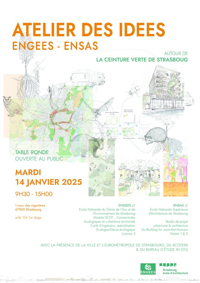 L'atelier des idées aura lieu le 14 janvier 2025 autour de la ceinture verte de Strasbourg. Lors de cet évènement ouvert au public, les étudiants de l'ENGEES Ecole nationale du génie de l'eau et de l'environnement de Strasbourg 3ème année VA Ecologie/Génie écologique et de l'Ecole nationale supérieure d'Architecture de Strasbourg Master 2 vous présenteront leurs travaux respectifs. Au programme, aménagement des territoires, écologie, urbanisme, trames, usages et représentations. Venez nombreux pour participer aux échanges, de 9h30 à 15h. Possibilité de nous rejoindre au fil de l'eau également. Salle 104 1er étage à la Manufacture des tabacs, 1 cour des cigarières à Strasbourg.