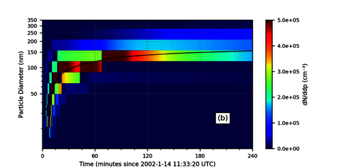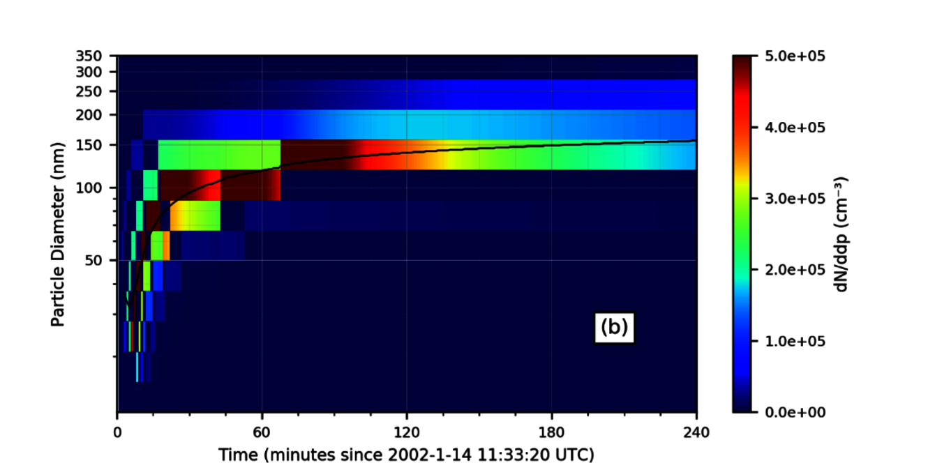 Distribution granulométrique des aérosols mesurés par un SMPS suivant 64 classes granulométriques (échelle de couleur) et diamètre moyen des aérosol (courbe noire) à la suite d’une ozonolyse de l’α-pinène dans une chambre de la chambre de simulation EUPHORE.