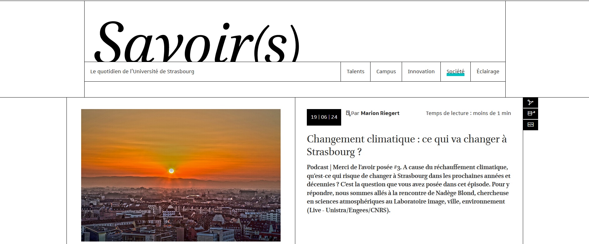 Parution dans le quotidien de l'Université de Strasbourg Savoir(s) - Changement climatique : ce qui va changer à Strasbourg ?