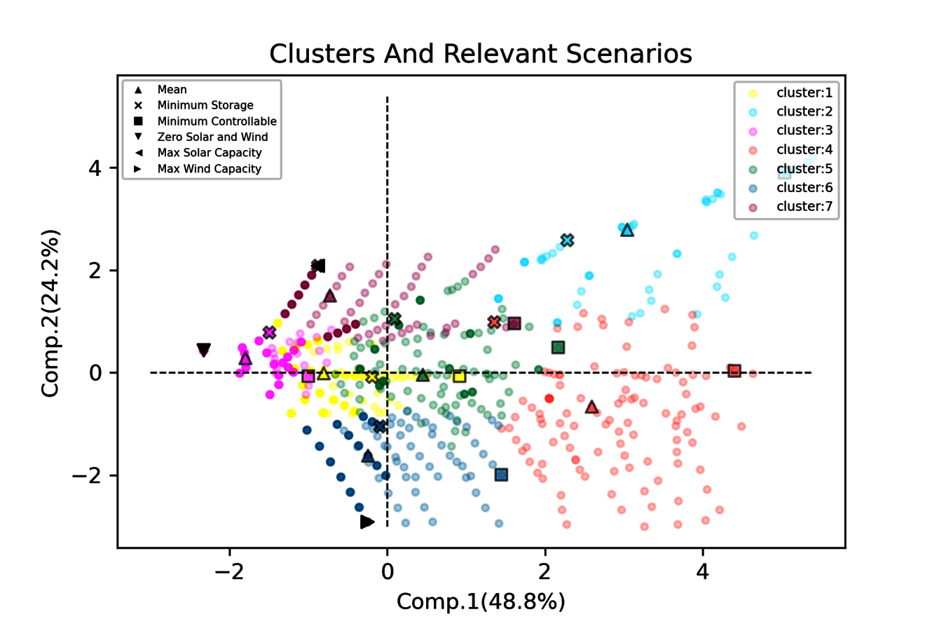 Exemple de résultats du Modèle Regional de Planification Energétique (REPM). Scénarios d’introduction d’énergie solaire et éolienne, triés par une Analyse en Composantes Principales (ACP). L’axe horizontal distingue des scénarios nécessitant peu (gauche) ou beaucoup (droite) de stockage. L’axe vertical oppose des scénarios plus basés sur l’énergie éolienne (bas) ou solaire (haut).